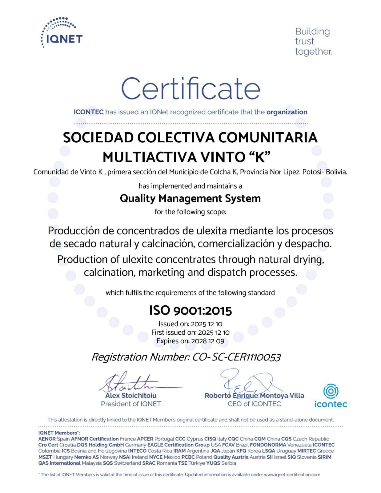 Estamos emocionados de anunciar que Soccomavk S.C. ha logrado la certificacion de calidad ISO 9001:2015 somos la primera empresa de la region dedicada a la extraccion e industrializacion de Ulexita que logra este hito tan importante